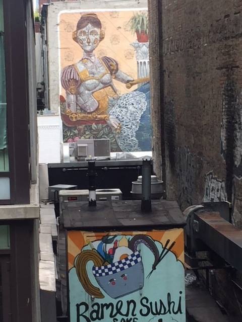 Op High Lane (een in verval geraakte spoorlijn destijds overwoekerd door onkruid stond op de nominatie om te worden gesloopt maar onder druk van omwonenden is tie behouden en omgetoverd tot een hele lange hoge stadstuin met veel bijzondere planten en bomen) stond een in plakjes gezaagde sculptuur. Zou die detailfoto de inhoud van de maag zijn ? even verderop piepte tussen twee onooglijke gebouwen deze muurschildering te voorschijn.